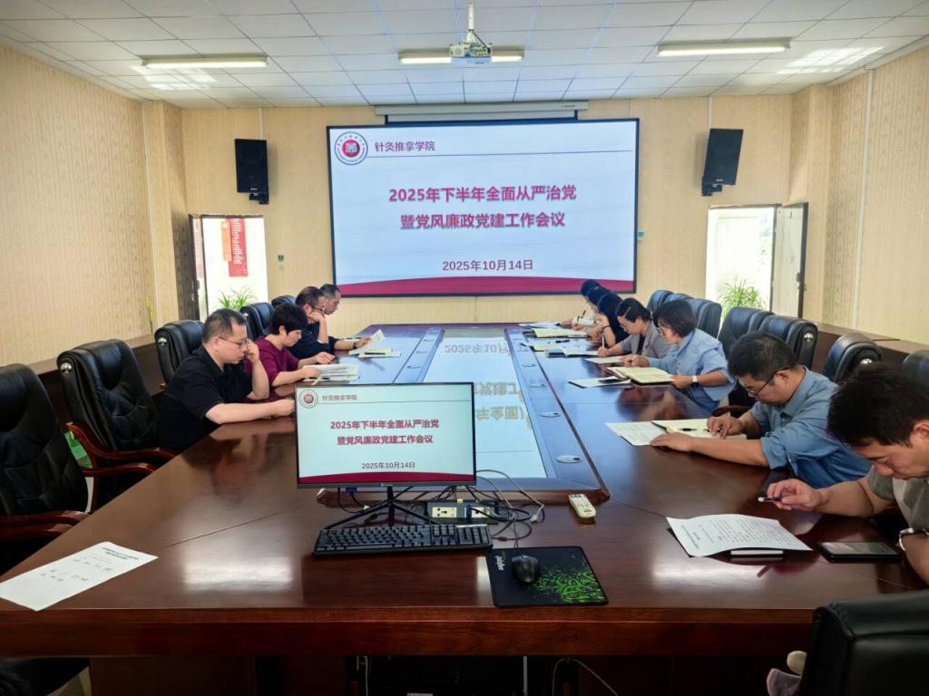 为深入贯彻中央、省委和学校党委关于全面从严治党的部署要求,切实担负起党要管党、全面从严治党主体责任,确保学院各项党建工作任务得到全面落实。2025年10月14日针灸推拿学院召开全面从严治党暨党风廉政建设工作会议,分析研判形势,研究解决瓶颈问题,全面部署2025年下半年学院党建工作。会议由学院党委副书记、院长陈波主持。学院处级、科级干部、各党支部书记参会。