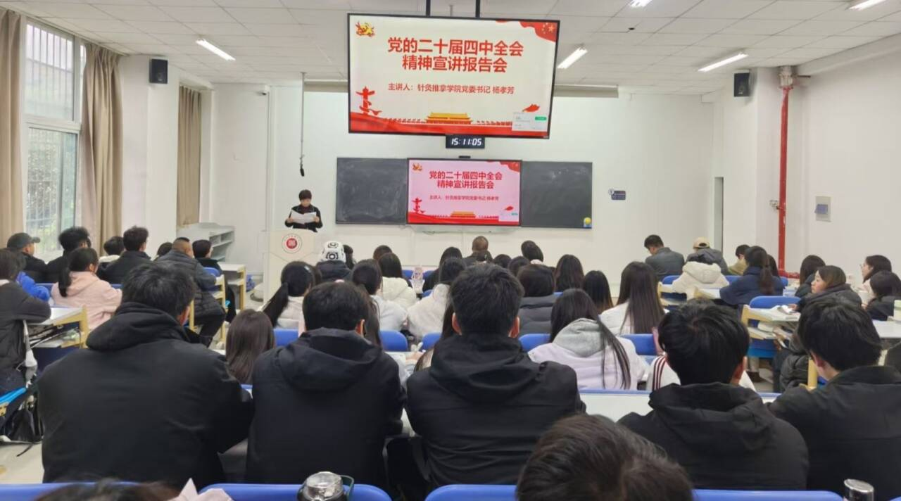 为推动党的二十届四中全会精神深入人心、落地生根,12月2日下午,针灸推拿学院杨孝芳党委书记开展党的二十届四中全会精神专题宣讲。宣讲会在从正楼1-11教室举行,学院党政领导班子成员、全体教职工、学生代表参加了报告会。