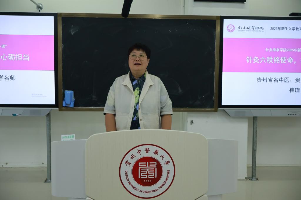 为帮助2025级新生快速熟悉针灸推拿专业学习节奏、适应大学课堂模式与校园生活环境,缓解初入新环境的陌生感与迷茫感,提前建立专业认知与学习规划意识。2025年9月27日针灸推拿学院开展新生入学教育“开学第一课”。本次主讲特邀贵州省名中医、贵州省教学名师,同时也是学院第一届硕士研究生崔瑾教授为新生带来“针灸六秩铭使命,推拿一心砺担当”开学第一课。