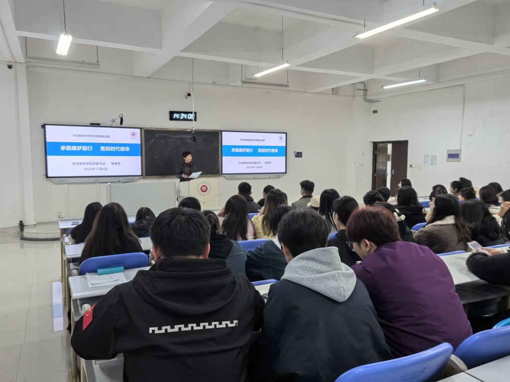 2025年11月6日,针灸推拿学院党委书记杨孝芳以“承载康梦前行,勇担时代使命”为主题,为2023级康复治疗学专升本班全体学生带来了一场内涵丰富、思想深刻的学生思想政治课。