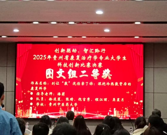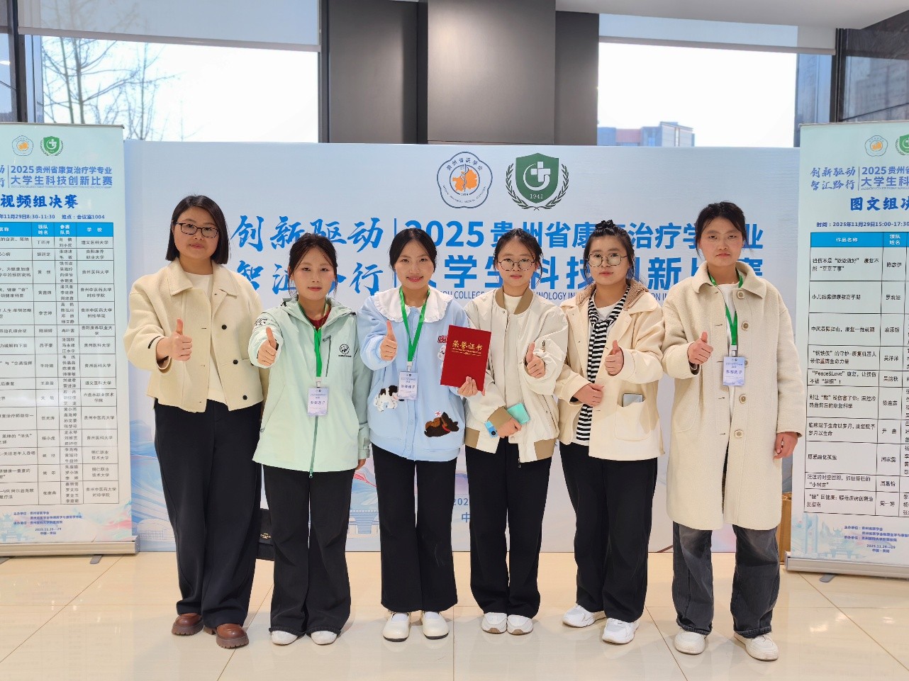 11月28—29日,由贵州省医学会、贵州省医学会物理医学与康复学分会主办,贵州医科大学附属医院承办的“2025年贵州省康复治疗学专业大学生科技创新比赛”在贵阳盘江诺富特酒店举行。我校针灸推拿学院2023级康复治疗学学生徐连莲、吴星月、张晴、倪言秀、程江丽在潘莉老师指导下,从来自全省各地医药高等院校的40支图文参赛队伍中脱颖而出闯入决赛,在决赛中最终以全省第2名的优异成绩斩获图文组大赛二等奖。