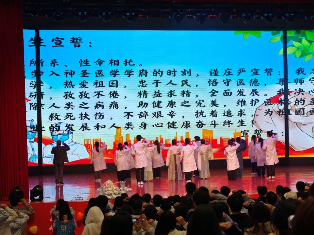 晚会伊始,针灸推拿学院党委书记杨孝芳教授发表致辞,向新生们致以热烈欢迎,寄语新生心怀家国,勇担使命;立德修身,践行院训;勤学苦练,夯实根基;笃学力行,开拓创新。希望同学们尽快完成从中学到大学的学习方式转变,从“学会”到“会学”,从“接受”到“探究”,培养批判性思维和创新能力。随后,全国名老中医路绍祖老师与师兄师姐的祝福视频温暖来袭,让新生们感受到学院深厚的传承底蕴与前辈的殷切期望。紧接着,针灸推拿学院党委副书记、院长陈波教授带领全体学生进行医学生宣誓,铿锵誓言彰显了学子们投身医学、恪守医德的决心。